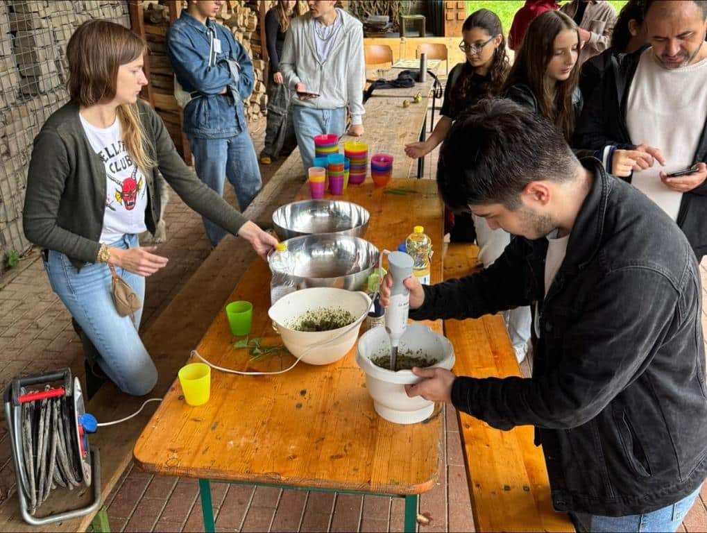 Bugünkü programımızda ilk durağımız Natur und Umwelt İstasyonu oldu. Burada bölgede iklim değişikliğinin etkilerini gözlemledik, doğadan otlar toplayarak pesto yaptık ve açık havada pestolu makarnamızın tadını çıkardık.